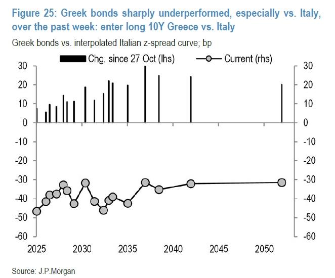 Να δημιουργήσουν θέσεις long στα ελληνικά 10ετή ομόλογα καλεί τους επενδυτές η JPMorgan, μετά και την πολύ καλή πορεία τους κατά την περασμένη εβδομάδα έναντι των ιταλικών και εν αναμονή μίας νέας αναβάθμισης από τον οίκο Fitch την 1η Δεκεμβρίου.