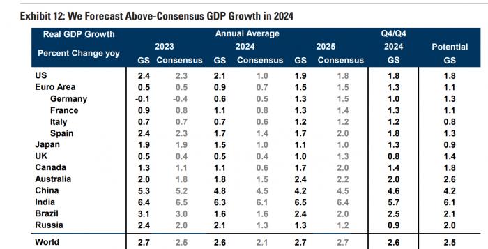Εκτιμά ότι υπάρχει περιορισμένος κίνδυνος ύφεσης με τις πιθανότητες για την αμερικανική οικονομία να φθάνουν μόλις στο 15%. Οι «άνεμοι» για την παγκόσμια ανάπτυξη το 2024 θα είναι ευνοϊκοί, συμπεριλαμβανομένης της ισχυρής αύξησης του πραγματικού εισοδήματος των νοικοκυριών, της μικρότερης επιβάρυνσης από τη νομισματική και δημοσιονομική σύσφιξη, της ανάκαμψης της μεταποιητικής δραστηριότητας και της αυξημένης προθυμίας των κεντρικών τραπεζών να προβούν σε ασφαλιστικές περικοπές σε περίπτωση επιβράδυνσης της ανάπτυξης.