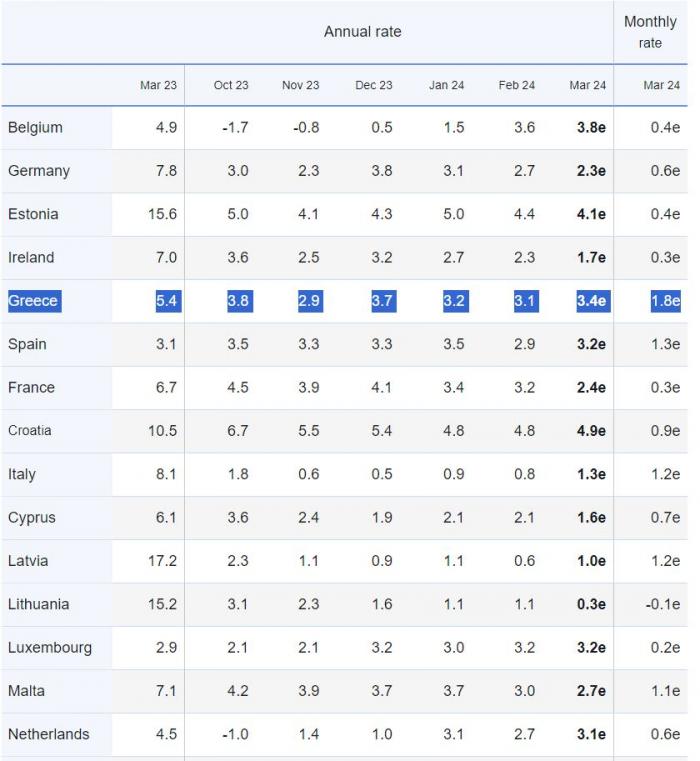 Στην πρώτη 5αδα των χωρών της ευρωζώνης με τον υψηλότερο πληθωρισμό συγκαταλέγεται για τον Μάρτιο η Ελλάδα, σύμφωνα με την εκτίμηση της Eurostat, με τον Εναρμονισμένο Δείκτη Τιμών Καταναλωτή να εκτιμάται ότι έχει φθάσει στο 3,4% από 3,1% που ήταν τον προηγούμενο μήνα.