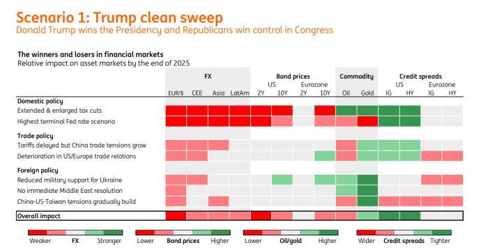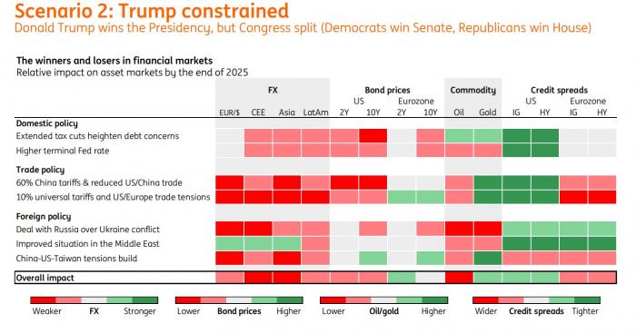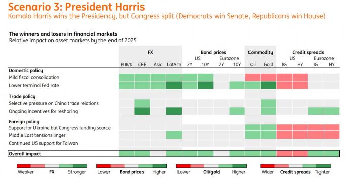 - Κεντρικές τράπεζες: Ένα πιο αυστηρό δημοσιονομικό περιβάλλον, σε συνδυασμό με συγκρατημένα ασθενέστερη ανάπτυξη και μειωμένη απειλή πληθωρισμού μπορεί να κάνει τη Fed να είναι πιο πρόθυμη να ασκήσει χαλαρότερη νομισματική πολιτική σε σχέση με το τι θα έπραττε εάν εκλέγονταν ο Τραμπ.