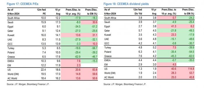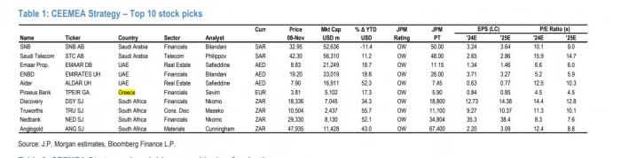 Επιπλέον, η JP Morgan δηλώνει «overweight» στην Ελλάδα έναντι της Πολωνίας, στην περιοχή CEEMEA (Κεντρικής και Ανατολικής Ευρώπης, Μέσης Ανατολής και Αφρικής), καθώς η χώρα έχει λιγότερη έκθεση στον ευρωπαϊκό μεταποιητικό τομέα και τα προβλήματα που μπορεί να προκύψουν στο παγκόσμιο εμπόριο, ενώ έχει και λιγότερη έκθεση σε θέματα Ουκρανίας/ασφάλειας.
