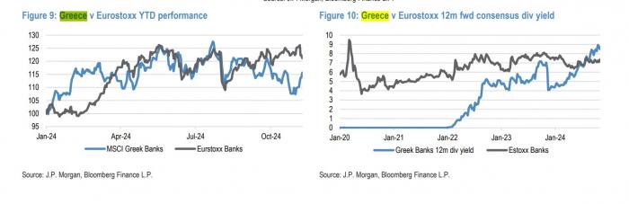 Για τις ελληνικές τράπεζες υπήρχε έως τώρα ο προβληματισμός ότι τα κέρδη σημαίνουν ελάχιστα δεδομένου των αδύναμων ισολογισμών και των μηδενικών μερισμάτων. Αλλά πλέον υπάρχει βεβαιότητα για τα μερίσματα και οι τράπεζα αυξάνουν την καθοδήγηση σχετικά με τους δείκτες πληρωμών. Την ίδια ώρα, ενώ τα αμοιβαία κεφάλαια έχουν μέτρια συμμετοχή στην περιοχή, «ανέκδοτες ενδείξεις» δείχνουν ότι το κύριο «ευρωπαϊκό χρήμα» έχει μικρή συμμετοχή σε αυτήν την αγορά της Ευρωζώνης. Η JP Morgan εκτιμά ότι θα υπάρξει αντιστροφή αυτής της τάσης.