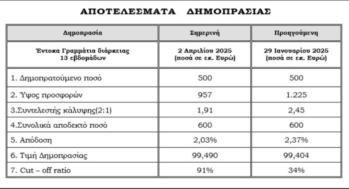 Έγιναν δεκτές προσφορές μέχρι του ύψους του δημοπρατηθέντος ποσού, καθώς και μη ανταγωνιστικές προσφορές ύψους 100 εκατ. ευρώ. Δεν θα γίνουν αποδεκτές συμπληρωματικές μη ανταγωνιστικές προσφορές την Πέμπτη 3 Απριλίου 2025. Σημειώνεται ότι κατά τις δημοπρασίες δεν καταβάλλεται προμήθεια.