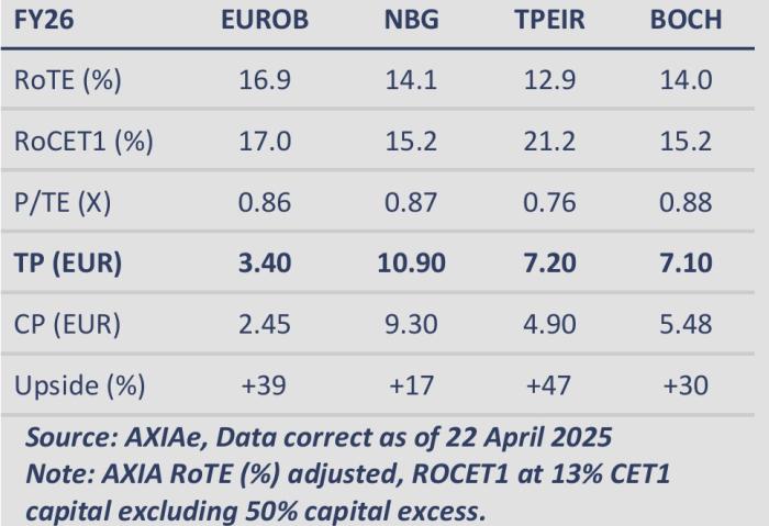 - Eurobank: Τιμή – στόχος 3,40 ευρώ (από 3 ευρώ πριν), με περιθώριο ανόδου 39%. Οι αναλυτές εκτιμούν ότι η Eurobank θα αναδείξει τη δυναμική της το προσεχές διάστημα, μέσω της διαφοροποίησης των πηγών εσόδων, της δημιουργίας συνεργειών και της διεθνούς της επέκτασης, στηριζόμενη από υψηλή κερδοφορία. Η μετοχή διαπραγματεύεται με δείκτη 0,86x επί των εκτιμώμενων ιδίων κεφαλαίων για το 2026 (P/B) και 5,97x επί των εκτιμώμενων κερδών (P/E), υποδηλώνοντας ελκυστικό περιθώριο ανόδου. Η σύσταση «αγορά» παραμένει.