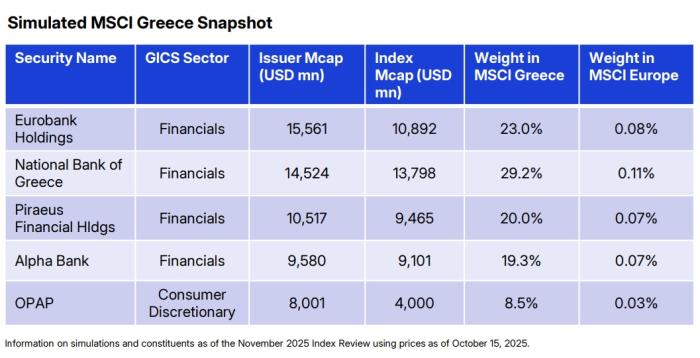 Από τις μετοχές πάντως που αναλύει η MSCI, η Εθνική θα έχει βαρύτητα 0,11%, η Eurobank 0,08%, η Πειραιώς με την Alpha Bank 0,07% και ο ΟΠΑΠ 0,03%.