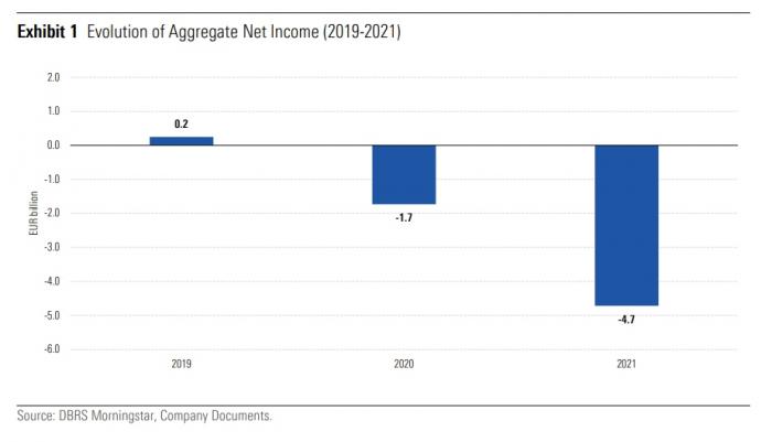 Εξετάζοντας τα οικονομικά δεδομένα των τραπεζών για το 2021, σημειώνεται στην έκθεση ότι ανακοίνωσαν συνολικές ζημίες 4,7 δισ. ευρώ για το 2021 από 1,7 δισ. που ήταν το 2020 και από καθαρά κέρδη 0,2 δισ. ευρώ το 2019.