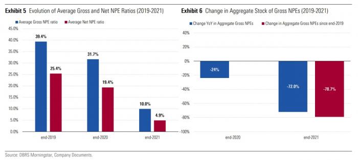 Αναφορικά με την πορεία του 2021 ο οίκος σημειώνει ότι τόσο οι προβλέψεις για ζημίες από επισφαλή δάνεια όσο και το κόστος κινδύνου ενισχύθηκαν σημαντικά, ενώ οι ελληνικές τράπεζες έχουν προχωρήσει σε μία τεράστια μείωση κινδύνου κατά τη διάρκεια των τελευταίων ετών, μέσω των τιτλοποιήσεων επισφαλών δανείων.