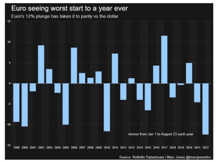 Ενεργειακή κρίση, συνεχής άνοδος του πληθωρισμού, πιθανώς καθυστερημένη αντίδραση της ΕΚΤ και φόβοι ότι η ευρωζώνη έχει μεγαλύτερες πιθανότητες να διολισθήσει σε ύφεση σε σύγκριση με τις ΗΠΑ δημιουργούν ένα περιβάλλον σχεδόν τοξικό για το κοινό ευρωπαϊκό νόμισμα.