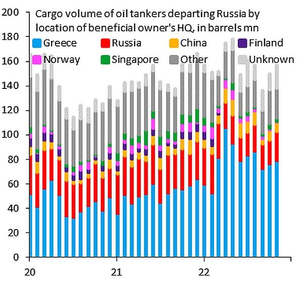 Ο υψηλός κίνδυνος στη μεταφορά ρωσικού πετρελαίου έχει αυξήσει τα μερίδια του λεγόμενου «σκοτεινού στόλου», δηλαδή των τάνκερ που κατέχονται από ιδιοκτήτες «αγνώστων στοιχείων» οι οποίοι είναι πρόθυμοι να συνεχίσουν να διαχειρίζονται ρωσικό πετρέλαιο παρά την απειλή των κυρώσεων. Τα πλοία αυτά αποτελούνται κυρίως από παλαιότερα πλοία και πολλά με ιστορικό συναλλαγών με καθεστώτα που υπόκεινται σε κυρώσεις, όπως το Ιράν.