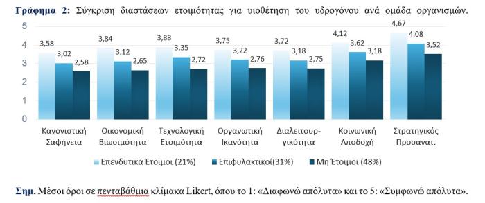 Ο δείκτης στρατηγικού προσανατολισμού εμφανίζει τη μεγαλύτερη μέση τιμή στη σχετική αξιολόγηση, γεγονός που δείχνει ότι οι περισσότεροι συμμετέχοντες θεωρούν το υδρογόνο αναπόσπαστο μέρος του μελλοντικού ενεργειακού συστήματος.
