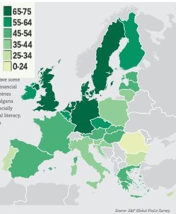 Οικονομικά εγγράμματο ποσοστό (%) του ενήλικου πληθυσμού στις διάφορες Ευρωπαϊκές χώρες: Σε θέση ηγέτη η βόρεια Ευρώπη και η θέση της Ελλάδας (Πηγή: S&P Global FinLit Survey 2014)