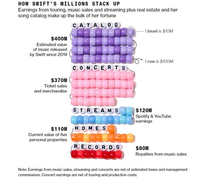 «Εκτός από ταλέντο, η Τέιλορ Σουίφτ είναι και σπουδαία οικονομολόγος», δήλωσε η Κάρολιν Σλόαν, οικονομολόγος στο Πανεπιστήμιο του Σικάγο. «Η Τέιλορ έχει σπουδαίες ιδέες, είναι σε θέση να τις κάνει πράξη και φαίνεται να είναι αρκετά ριψοκίνδυνη». Ενώ οι εκτιμήσεις για τα κέρδη της περιοδείας Eras αφθονούν, η ανάλυση του Bloomberg είναι συντηρητική και βασίζεται μόνο σε περιουσιακά στοιχεία και κέρδη που μπορούσαν να επιβεβαιωθούν ή να εντοπιστούν από δημοσιευμένα στοιχεία. Ο υπολογισμός έλαβε υπόψη τα εξής: την εκτιμώμενη αξία του μουσικού της καταλόγου και των πέντε σπιτιών της, καθώς και τα κέρδη από συμφωνίες streaming, πωλήσεις μουσικής, εισιτήρια συναυλιών και εμπορεύματα. Οι εκτιμήσεις συνυπολογίζουν τον αντίκτυπο του φόρου εισοδήματος, τα έξοδα παραγωγής και ταξιδιών της περιοδείας και τις προμήθειες που καταβάλλονται σε μάνατζερ και ατζέντηδες.