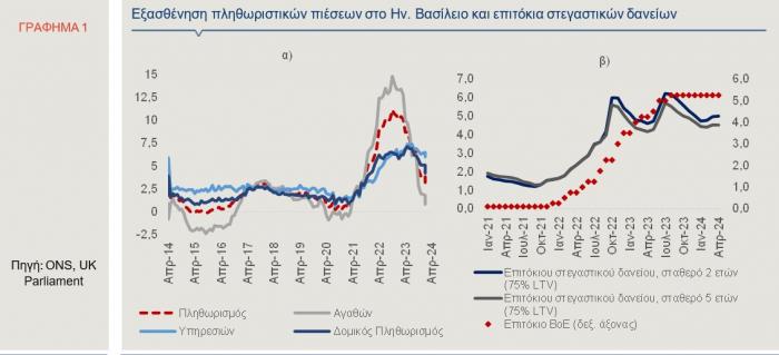 - Η κυβέρνηση επιχειρεί να κεφαλαιοποιήσει τις θετικές οικονομικές εξελίξεις για την ενίσχυση της προεκλογικής της εκστρατείας. Η οικονομία παρουσιάζει σημάδια ανάκαμψης, ενώ παρατηρείται ταχεία αποκλιμάκωση των πληθωριστικών πιέσεων, άρα φαίνεται να επιτυγχάνει την «ομαλή» προσγείωση». Προς επίρρωση αυτών των εξελίξεων, το Διεθνές Νομισματικό Ταμείο, στις προβλέψεις του Απριλίου, αναθεώρησε προς τα άνω τις προβλέψεις του και εκτιμά ανάπτυξη 0,7%, το 2024, από 0,5% και 1,5%, το 2025 (Staff Concluding Statement of the 2024, Article IV Mission, UK, Μάιος 2024). Μετά από δύο διαδοχικά τρίμηνα με αρνητικούς ρυθμούς ανάπτυξης, η οικονομία του ΗΒ πέτυχε μεγέθυνση 0,6%, στο πρώτο τρίμηνο, σε τριμηνιαία βάση, ενώ ο πληθωρισμός υποχώρησε στο 2,3% σε ετήσια βάση, τον Απρίλιο, από 3,2%, τον Μάρτιο, σημαντικά χαμηλότερα από το 11,1%, τον Οκτώβριο του 2022 (Γράφημα 1α). Ωστόσο, επισημαίνεται ότι η κεντρική τράπεζα του Ην. Βασιλείου (BoE) προβλέπει οριακή αναθέρμανση του πληθωρισμού, το επόμενο έτος. Οι αγορές αναμένουν την πρώτη μείωση του επιτοκίου από την BoE, μετά από τις εκλογές. Σημειώνεται ότι η περιοριστική νομισματική πολιτική είχε σημαντική επιβάρυνση στον προϋπολογισμό των νοικοκυριών και δη, στην αύξηση των δανειακών τους υποχρεώσεων. Στο Γράφημα 1β, απεικονίζονται τα επιτόκια των ενυπόθηκων δανείων, τα οποία έχουν αυξηθεί σημαντικά.