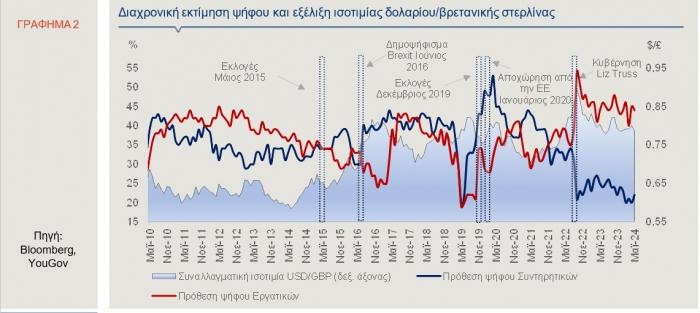 Με βάση τις παραπάνω εξελίξεις, η πρόωρη προσφυγή στις κάλπες έρχεται ως απόρροια των βελτιωμένων στοιχείων για την οικονομία, σε μία προσπάθεια του κυβερνώντος κόμματος να περιορίσει τη διαφορά στην πρόθεση ψήφου (Γράφημα 2). Επιπλέον, οι αγορές δεν ανησυχούν για εκτροχιασμό των δημόσιων οικονομικών από την αλλαγή σκυτάλης και αναμένουν ότι το κόμμα που θα επικρατήσει στις εκλογές, θα διατηρήσει τη μεταρρυθμιστική πολιτική, με στόχο την εξυγίανση των δημόσιων οικονομικών, παρά τις σημαντικές δημοσιονομικές και οικονομικές προκλήσεις (The UK’s public finances: is it time to reform the fiscal rules? Economics Observatory, Μάιος 2024).