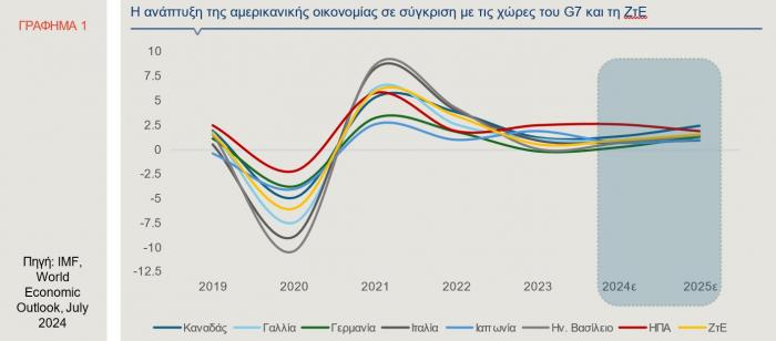 Είναι αξιοσημείωτο δε, ότι οι ΗΠΑ καταγράφουν καλύτερες επιδόσεις σε σχέση με τις άλλες χώρες του G7 (Γράφημα 1). Σε αυτή την εξέλιξη, μέχρις στιγμής, συνέβαλε και η νομισματική πολιτική της Ομοσπονδιακής Τράπεζας των ΗΠΑ (Fed), η οποία φαίνεται να έχει επιτύχει την «ήπια προσγείωση», επιβραδύνοντας τον πληθωρισμό δίχως να προκαλέσει ύφεση. Ωστόσο, η Fed θα πρέπει να βρίσκεται σε επαγρύπνηση για τη διατήρηση αυτής της δύσκολης στρατηγικής εξισορρόπησης.