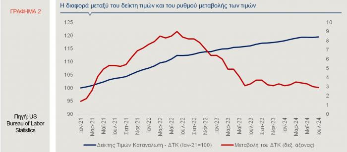 Τέλος, στο πεδίο του πληθωρισμού, η αύξηση του δείκτη τιμών καταναλωτή (ΔΤΚ) είναι επιβραδυνόμενη από το 2023. Μετά την κατακόρυφη άνοδο στο 9,0%, τον Ιούνιο του 2022, που ήταν το υψηλότερο επίπεδο των τελευταίων 40 ετών, ο πληθωρισμός υποχώρησε στο 2,9%, τον Ιούλιο του 2024. Ωστόσο, ο πληθωρισμός εξακολουθεί να βρίσκεται πάνω από τον στόχο του 2% της Fed.