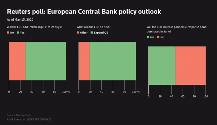 Πολλοί αναλυτές αναμένουν ότι η ΕΚΤ θα αρχίσει να αγοράζει ομόλογα εταιρειών που έχασαν την αξιολόγηση investment-grade στη διάρκεια της πανδημίας. Υπάρχουν, όμως, ταυτόχρονα αρκετά στελέχη της ΕΚΤ τα οποία εμφανίζονται διστακτικά στην ανάληψη υψηλού επιπέδου κινδύνων. Η ΕΚΤ απογοήτευσε τον Απρίλιο τις αγορές όταν επέλεξε να μην συμπεριλάβει τους επονομαζόμενους «έκπτωτους αγγέλους» στο πρόγραμμα ποσοτικής χαλάρωσης. Ο Γερούν φαν ντεν Μπροκ της ING αναμένει ότι εταιρικό χρέος της Ευρωζώνης, συνολικού ύψους 100 δισ. ευρώ θα βρεθεί μέσα στους επόμενους 12-18 μήνες εκτός της κατηγορίας υψηλής επενδυτικής διαβάθμισης (investment-grade).