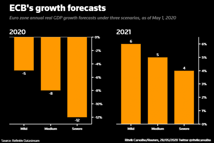 Η Κριστίν Λαγκάρντ έχει εκτιμήσει πρόσφατα ότι η ύφεση στην ευρωζώνη θα κυμανθεί από 8% έως και άνω του 12% για το 2020, ενώ βάσει της προηγούμενης εκτίμησης θα βρίσκονταν στην κλίμακα του 5% έως 12%. Οι αναθεωρημένες προβλέψεις που θα παρουσιάσει την Πέμπτη η ΕΚΤ το πιθανότερο θα αντανακλούν τις απαισιόδοξες εκτιμήσεις της κυρίας Λαγκάρντ, επιχειρηματολογώντας υπέρ της ανάγκης πρόσθετων μέτρων νομισματικής στήριξης. Η προσοχή θα εστιασθεί και στις προβλέψεις για τον πληθωρισμό, καθώς η ΕΚΤ θα πρέπει να παρουσιάσει στρατηγική για αύξηση των τιμών καταναλωτή, οι οποίοι αυτή τη στιγμή κινούνται κοντά στο μηδέν, δηλαδή σε χαμηλά τετραετίας.