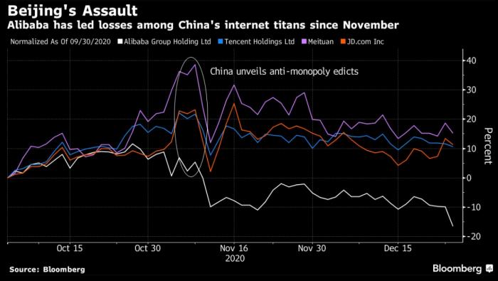 Στο στόχαστρο των αντιμονοπωλιακών αρχών της Κίνας, λόγω «υπονοιών για μονοπωλιακές πρακτικές», τέθηκε η εταιρεία του Τζακ Μα, η Alibaba. Η Κίνα ξεκίνησε έρευνα για φερόμενες μονοπωλιακές πρακτικές της Alibaba Group Holding Ltd. καθώς και της θυγατρικής της εταιρείας, Ant Group Co., κλιμακώνοντας τον έλεγχο της διαδικτυακής αυτοκρατορίας του δισεκατομμυριούχου.