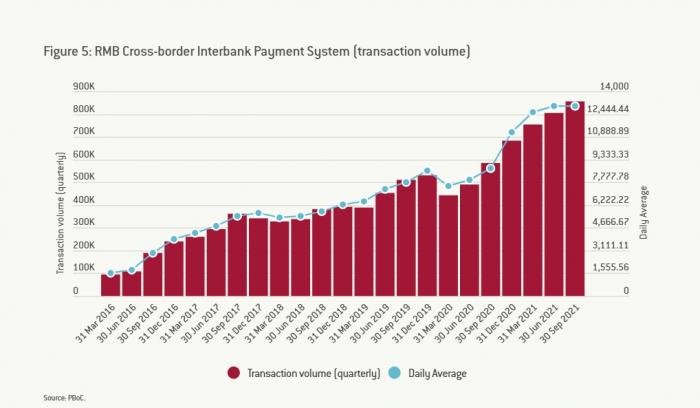 - Τρίτον, η CIPS δεν διαθέτει ούτε τη ρευστότητα ούτε τα μέλη για να την καταστήσει συγκρίσιμη με την πλατφόρμα που χρησιμοποιούν σχεδόν όλες οι τράπεζες για τις διεθνείς συναλλαγές τους, το Διατραπεζικό Σύστημα Πληρωμών (CHIPS) του Clearing House. Ο όγκος των πληρωμών που διεκπεραιώνονται μέσω CIPS έχει αυξηθεί ραγδαία από τον Σεπτέμβριο του 2020, αλλά μετρά μόνο 13.000 συναλλαγές την ημέρα, σε σύγκριση με πάνω από 240.000 για το CHIPS.