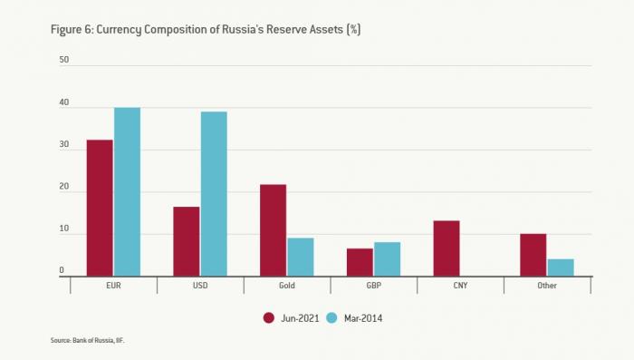 Η Ρωσία πρέπει επίσης να βρει εναλλακτική μετά από το πάγωμα των αποθεμάτων σκληρού συναλλάγματος από τη Δύση. Σχεδόν τα μισά από τα 643 δισεκατομμύρια δολάρια σε συναλλαγματικά αποθέματα της Ρωσίας διατηρούνται σε ευρώ και δολάρια (βάσει στοιχείων έως και τις 30 Ιουνίου 2021) και σχεδόν τα τρία τέταρτα είναι επενδύσεις που βρίσκονται σε χώρες που έχουν επιβάλει κυρώσεις στη Ρωσία. Εν τω μεταξύ, περίπου το ένα πέμπτο των ρωσικών αποθεμάτων είναι σε χρυσό που βρίσκονται φυσικά στη Ρωσία. Οποιαδήποτε συναλλαγή σε αυτό το στοιχείο των αποθεματικών της είναι επίσης πιθανό να επηρεαστεί από τις κυρώσεις.