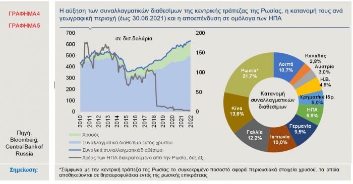 Όσον αφορά στην κατανομή των συνολικών συναλλαγματικών διαθεσίμων, σύμφωνα με την κεντρική τράπεζα της Ρωσίας, μέχρι τις 30.06.2021, το 21,7% βρισκόταν εντός της ρωσικής επικράτειας και αφορούσε περιουσιακά στοιχεία χρυσού (Γράφημα 5). Παράλληλα, το 13,8% των συνολικών συναλλαγματικών διαθεσίμων βρισκόταν στην Κίνα, ενώ ακολουθεί η Γαλλία με 12,2%, η Ιαπωνία με 10% και η Γερμανία με 9,5%. Επιπλέον, το 32,3% των συνολικών συναλλαγματικών διαθεσίμων ήταν σε ευρώ, το 16,4% σε δολάρια ΗΠΑ και το 13,1% σε κινεζικά γουάν.