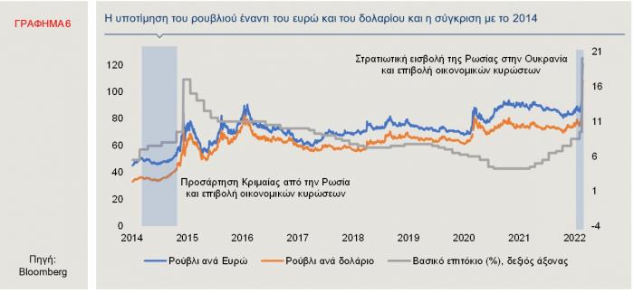 Η επιβολή κυρώσεων είχε άμεσο αντίκτυπο στο ρούβλι, καθώς, στις 28 Φεβρουαρίου, υποτιμήθηκε κατά 25% έναντι του ευρώ και κατά 18% έναντι του δολαρίου, παρά την αύξηση του βασικού επιτοκίου από την κεντρική τράπεζα της Ρωσίας, στο 20% από 9,5% (Γράφημα 6). Η διολίσθηση του ρουβλίου είναι πολύ μεγαλύτερη σε σύγκριση με την κρίση του 2014, γεγονός που ενδεχομένως αποδίδεται στην ταχύτερη και ισχυρότερη επιβολή κυρώσεων.