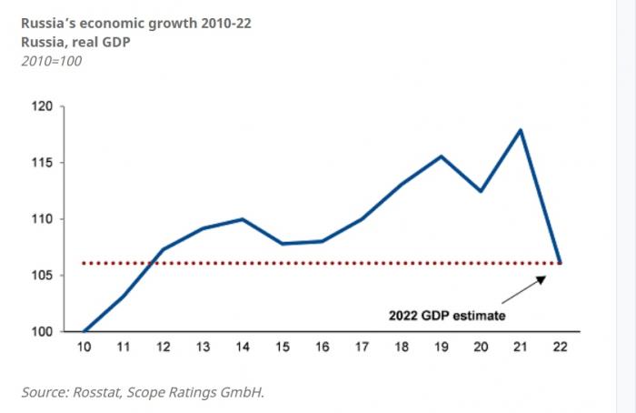 Όπως αναφέρεται στην έκθεση η ταχέως συρρικνούμενη οικονομία της χώρας αποτελεί μία δραματική ανατροπή από τις οικονομικές προοπτικές πριν από τον πόλεμο, όταν οι ανοδικές τιμές της ενέργειας και η ανάκαμψη από την κρίση του Covid-19 υπογράμμισαν τις προσδοκίες για ισχυρή ανάπτυξη. Σημειώνεται ότι η Scope τον Δεκέμβριο είχε εκτιμήσει ότι ο ρυθμός ανάπτυξης της Ρωσίας θα έφθανε φέτος το 2,7%, αλλά οι αβεβαιότητες που δημιουργεί ο πόλεμος αλλά και η πραγματική επίπτωση των κυρώσεων καθιστούν, πλέον, ανέφικτη αυτήν την πρόβλεψη.
