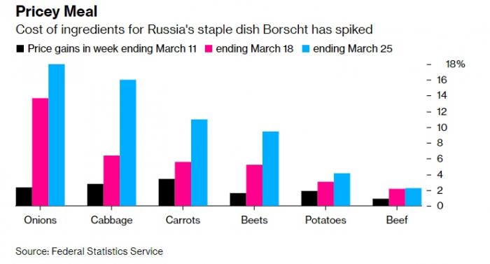 Ένα στοιχείο που μπορεί να δείξει πώς ακριβώς κινείται στη ρωσική περίπτωση είναι, όπως σημειώνει το Bloomberg, η πορεία των τιμών για το παραδοσιακό ρωσικό φαγητό, borscht.