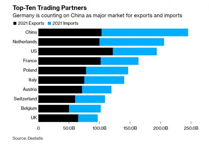 Μετά από χρόνια προώθησης των εξαγωγών προς την Κίνα και οικοδόμησης ενεργειακών δεσμών με τη Ρωσία, η μεγαλύτερη οικονομία της Ευρώπης αντιμετωπίζει ένα επικίνδυνο κοκτέιλ κινδύνων. Η μεγάλη εξάρτησή της από τη μεταποίηση την καθιστά πιο ευάλωτη από άλλες ευρωπαϊκές χώρες σε πολεμικές διαταραχές του ρωσικού ενεργειακού εφοδιασμού και σε εμπλοκές στο εμπόριο. Το αποτέλεσμα είναι ο κίνδυνος συρρίκνωσης και ακόμη υψηλότερων τιμών που συμπιέζουν τους, ήδη, ανήσυχους καταναλωτές.