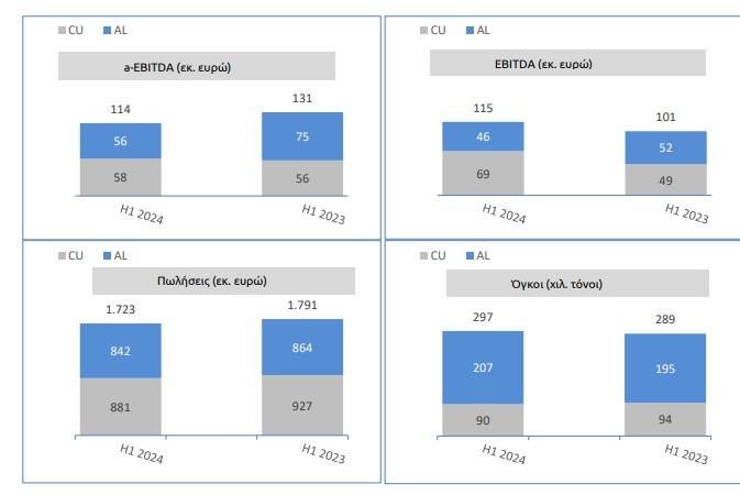 Το a-EBITDA διαμορφώθηκε στα 55,9 εκ. ευρώ στο α’ εξάμηνο του 2024 έναντι 75,4 εκ. ευρώ του α’ εξαμήνου του 2023. Τα κέρδη προ φόρων ανήλθαν σε 9,0 εκ. ευρώ, έναντι κερδών 10,3 εκ. ευρώ την αντίστοιχη περίοδο του 2023 με τα αποτελέσματα μετάλλου να διαμορφώνονται σε ζημίες 9,4 εκ. ευρώ έναντι 23,7 εκ. ευρώ την αντίστοιχη περσινή περίοδο. Οι επενδύσεις του κλάδου ανήλθαν σε 22,9 εκ. ευρώ, έναντι 39,2 εκ. του πρώτου εξαμήνου του 2023. Κλάδος Χαλκού