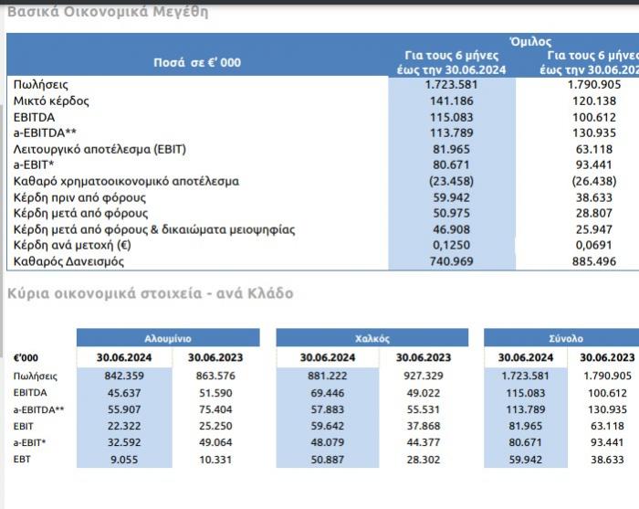 Τα ενοποιημένα μικτά κέρδη ανήλθαν στα 141,2 εκ. ευρώ το Α’ εξάμηνο του 2024, έναντι 120,1 εκ. ευρώ την αντίστοιχη περσινή περίοδο. Τα αναπροσαρμοσμένα ενοποιημένα κέρδη πριν από φόρους, τόκους, αποσβέσεις, αποτέλεσμα μετάλλου και λοιπά έκτακτα έσοδα και έξοδα (a-EBITDA), τα οποία απεικονίζουν καλύτερα την οργανική και ταμειακή κερδοφορία του Ομίλου, μειώθηκαν κατά 13,1% και διαμορφώθηκαν στα 113,8 εκ. ευρώ το α’ εξάμηνο του 2024 έναντι 130,9 εκ. Αντίστοιχα, τα ενοποιημένα κέρδη προ φόρων, τόκων και αποσβέσεων (EBITDA), διαμορφώθηκαν στα 115,1 εκ. ευρώ έναντι 100,6 εκ. ευρώ του α’ εξάμηνο του 2023, ως αποτέλεσμα των λογιστικών κερδών ύψους 7,0 εκ. ευρώ, από 29,3 εκ. ευρώ ζημιές το περσινό πρώτο εξάμηνο.