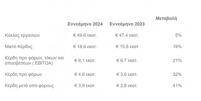 Τα κέρδη μετά από φόρους ανήλθαν σε 3,9 εκατ. ευρώ βελτιωμένα κατά 41% (έναντι 2,8 εκατ. Ευρώ στο εννεάμηνο του 2023). Στη βελτίωση των Κερδών μετά από φόρους συντελεί και ο μειωμένος φόρος εισοδήματος ως αποτέλεσμα της ολοκλήρωσης επενδυτικών προγραμμάτων που προβλέπουν φοροαπαλλαγές.