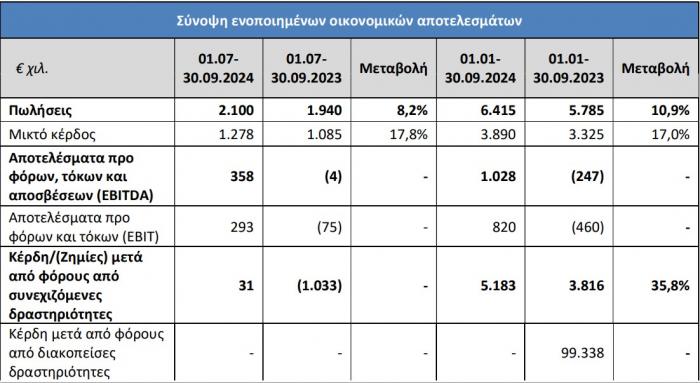 Πιο αναλυτικά και βάσει της ανακοίνωσης της εταιρείας οι πωλήσεις του Ομίλου ανήλθαν σε € 2,1 εκ. το γ΄ τρίμηνο 2024 και € 6,4 εκ. το εννιάμηνο 2024, έναντι € 1,9 εκ. και € 5,8 εκ. τις αντίστοιχες περιόδους του 2023, αυξημένες κατά 8,2% και 10,9% αντίστοιχα.
