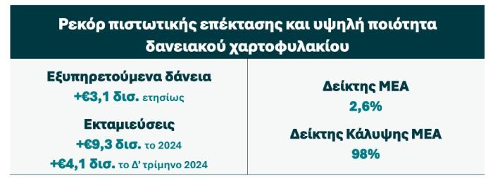 Το 2024, η αύξηση των εξυπηρετούμενων δάνειων ανήλθε σε επίπεδα ρεκόρ των €3,1 δισ. σε ετήσια βάση, υπερβαίνοντας σημαντικά τους στόχους μας