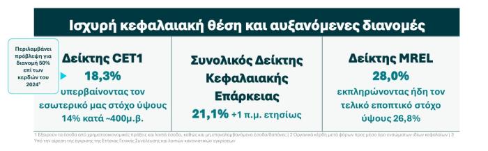 Οι κεφαλαιακοί μας δείκτες συνεχίζουν διατηρούνται σε επίπεδα που υπερβαίνουν κατά πολύ τους στόχους μας, με το δείκτη CET1 και το Συνολικό Δείκτη Κεφαλαιακής Επάρκειας να ανέρχονται σε 18,3% και 21,1% αντίστοιχα, μετά από πρόβλεψη για διανομή στους μετόχους μας ύψους 50% από τα κέρδη του 2024 έναντι 30% που καταβλήθηκε πέρυσι. Πρόθεσή μας είναι η ανταμοιβή των μετόχων μας να περιλαμβάνει την αυξημένη διανομή μερίσματος (35%) και την επαναγορά μετοχών (15%).
