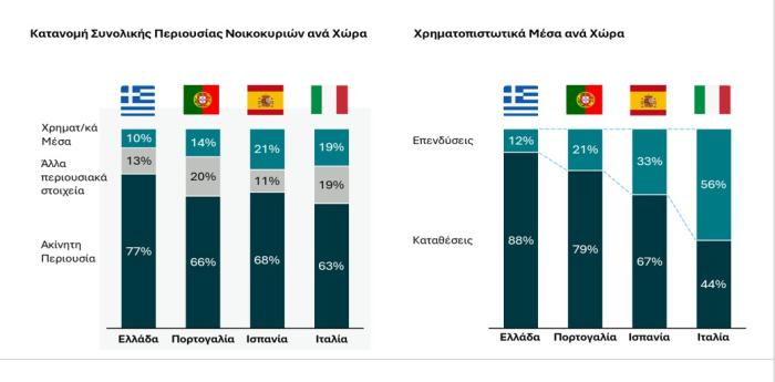 Αναφερόμενος στο γενικότερο πλαίσιο, ο κος Βαρελτζίδης εξήγησε ότι η περιουσία των νοικοκυριών στην Ελλάδα είναι παραδοσιακά επικεντρωμένη κυρίως στα ακίνητα κατά ποσοστό 77%, κατά 13% σε λοιπά περιουσιακά (πχ εταιρικές συμμετοχές) και μόλις 10% σε χρηματοοικονομικά μέσα (ρευστά διαθέσιμα).
