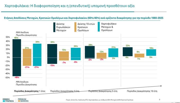 Συμπερασματικά και σύμφωνα με μελέτη της Διεύθυνσης Οικονομικών Αναλύσεων της Εθνικής Τράπεζας για την περίοδο 1980-2024 ένα διευρυμένο επενδυτικό χαρτοφυλάκιο (60% μετοχές, 40% ομόλογα) είχε πάντα θετική απόδοση αν η περίοδος διακράτησης ήταν από 5 έτη και πάνω.