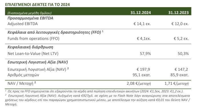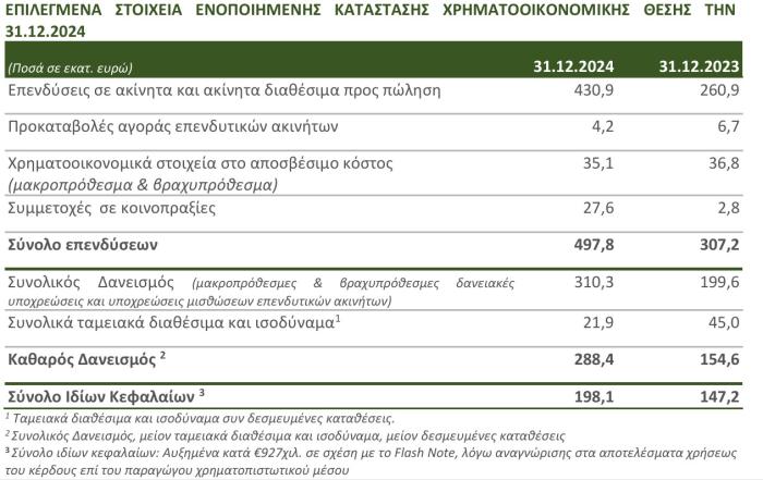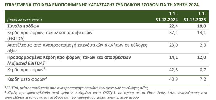 - Αύξηση εσόδων κατά 18% και αύξηση λειτουργικής κερδοφορίας (Adjusted EBITDA) κατά 18%. σε ενοποιημένη βάση, σε σχέση με το 2023. Το κέρδος από τις πωλήσεις επενδυτικών ακινήτων ανήλθε σε € 1,5 εκατ. για το 2024 έναντι € 1,2 εκατ. για το 2023. Τα κέρδη μετά φόρων διαμορφώθηκαν σε σημαντικά υψηλότερα επίπεδα επηρεαζόμενα κυρίως από τις υψηλότερες αναπροσαρμογές επενδύσεων σε εύλογη αξία σε σχέση με την προηγούμενη χρήση αλλά και την αύξηση της αξίας των επενδύσεων σε κοινοπραξίες & συγγενείς εταιρείες ύψους € 11,7 εκατ..
