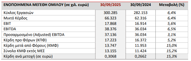 Ειδικότερα, στον πίνακα παρουσιάζονται τα βασικά οικονομικά μεγέθη του Ομίλου για το εννεάμηνο του 2025, σε σχέση με την αντίστοιχη περίοδο του 2024: