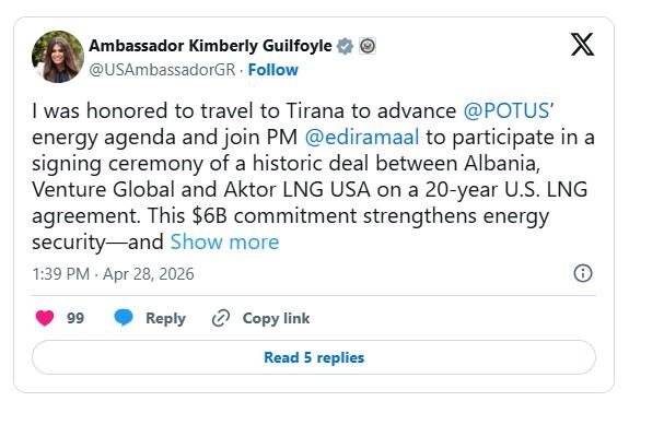 Εικοσαετή συμφωνία προμήθειας αμερικανικού LNG, συνολικού ύψους 6 δισ. ευρώ, υπέγραψαν η Αλβανία, η Venture Global και η Aktor LNG USA, όπως αποκάλυψε πριν από λίγη ώρα, η Πρέσβης των ΗΠΑ στην Ελλάδα, Κίμπερλι Γκίλφοϊλ.