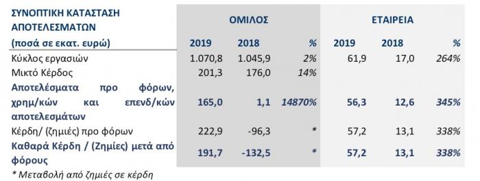 - Τα ενοποιημένα αποτελέσματα του συνόλου των εταιρειών να επιδεικνύουν κερδοφορία 191,7 εκατ. ευρώ έναντι ζημιών 132,5 εκατ. ευρώ του προηγούμενου έτους 2018, (το 2018 ήταν και ο πρώτος χρόνος ένταξης στην ΕΕΣΥΠ των «Λοιπών Θυγατρικών»), καθώς και βελτίωση των μεγεθών σχεδόν στο σύνολο των θυγατρικών εταιρειών.