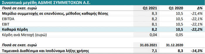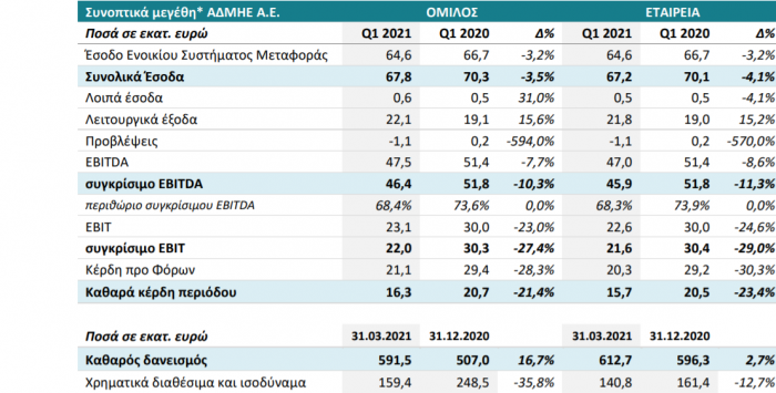 Τα ενοποιημένα κέρδη προ τόκων, φόρων και αποσβέσεων (EBITDA) μειώθηκαν κατά 7,7% σε ετήσια βάση σε 47,5 εκατ. ευρώ έναντι 51,4 εκατ. ευρώ το α’ τρίμηνο 2020.
