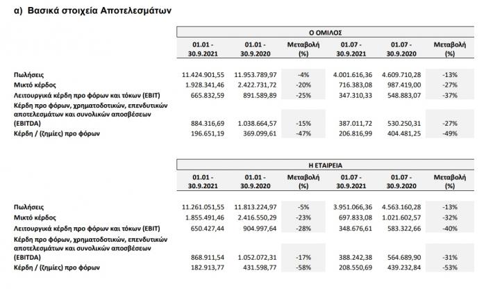 Όπως προκύπτει από την παράθεση των ανωτέρω βασικών οικονομικών μεγεθών του εννεάμηνου, τόσο σε επίπεδο Ομίλου όσο και σε επίπεδο Εταιρίας, καταγράφηκε ελαφρά μείωση των πωλήσεων κατά 5% περίπου, ο δε EBITDA ήταν μειωμένος κατά 15% για τον Όμιλο και 17% για την εταιρεία. Στο τρίτο τρίμηνο, καταγράφηκε μείωση των πωλήσεων σε σχέση με την προηγούμενη χρήση σε ποσοστό 13%.
