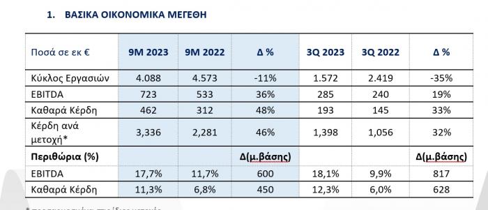 • O Κύκλος Εργασιών διαμορφώθηκε σε €4.088 εκατ., σε σύγκριση με €4.573 εκατ. το Εννεάμηνο του 2022, μείωση που ήρθε ως συνέπεια της αποκλιμάκωσης των τιμών ενέργειας.