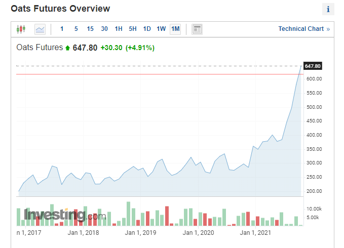 -- Και μ’ αυτά και μ’ αυτά φτάνουμε στο σημείο που η ταπεινή βρώμη σύντομα θα αποτελεί είδος πολυτελείας που θα συνοδεύει το πρωινό μόνο των πλουσίων. Η τιμή των futures βρώμης έχει εκτοξευτεί από το επίπεδο των 290 δολαρίων που ήταν στις αρχές του έτους στα 647 δολάρια, που αποτελούν τα υψηλότερα επίπεδα των τελευταίων 5 ετών.