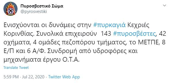 Δεν υπάρχει πλέον ενεργό μέτωπο στην πυρκαγιά στις Κεχριές Κορινθίας, ωστόσο συνεχίζει να έχει πολλές διάσπαρτες εστίες σε μια μεγάλη περίμετρο, με διαρκείς αναζωπυρώσεις.