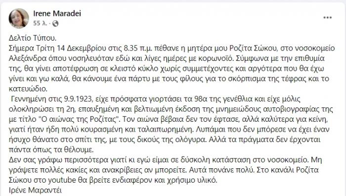 Ειδικότερα, η κυρία Μαραντέι, έγραψε: «Σήμερα Τρίτη 14 Δεκεμβρίου στις 8.35 π.μ. πέθανε η μητέρα μου Ροζίτα Σώκου, στο νοσοκομείο Αλεξάνδρα όπου νοσηλευόταν εδώ και λίγες ημέρες με κορονοϊό. Σύμφωνα με την επιθυμία της, θα γίνει αποτέφρωση σε κλειστό κύκλο χωρίς συμμετέχοντες και αργότερα που θα έχω γίνει και γω καλά, θα κάνουμε ένα πάρτυ με τους φίλους για το σκόρπισμα της τέφρας και το κατευώδιο.