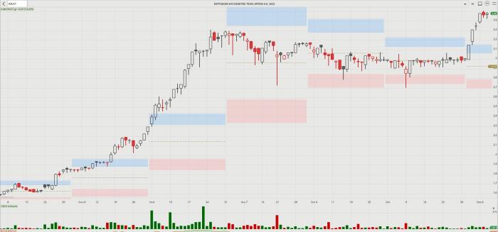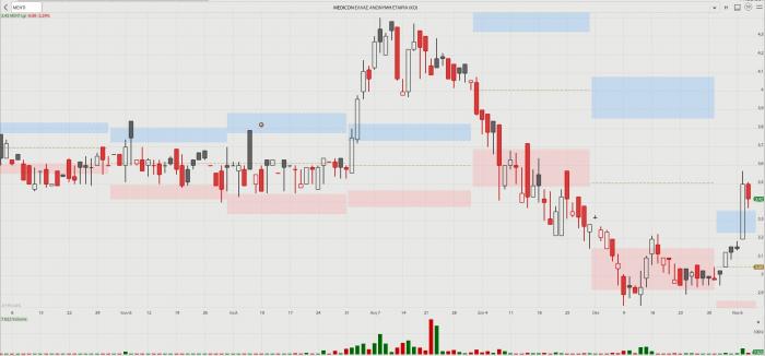 -- Medicon: Μπορεί να διόρθωσε σε ποσοστό 2,29% χθες, όμως, έχοντας ανεβασμένους όγκους, κερδίζει 14,77% το Νοέμβριο. Χθες έκλεισε στα 3,42 ευρώ, έχοντας υψηλό 52 εβδομάδων στα 4,40 ευρώ απις 8 Αυγούστου φέτος κκαι χαμηλό στσα 2,84 ευρώ από τις 12 Οκτωβρίου επίσης φέτος. Εισήλθε στο Χ.Α. στις 11 Ιουλίου 2001 με τιμή εισαγωγής τα 8,80 ευρώ. Στα 15,1 εκατ. ευρώ η αποτίμηση.