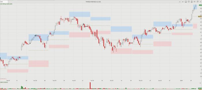 Η πορεία της μετοχής της Τράπεζας Πειραιώς, 20 Απριλίου 2023 - 5 Φεβρουαρίου 2024
